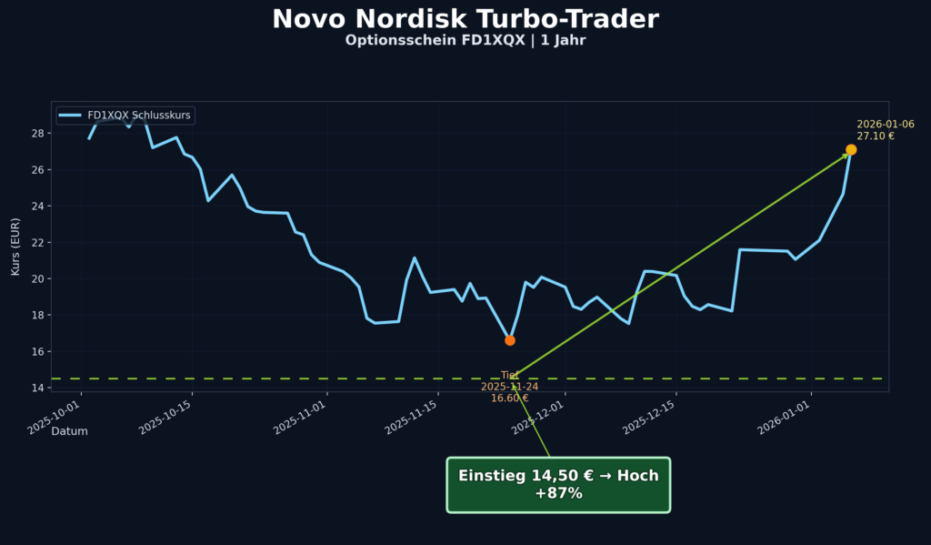 Mit dem Turbo-Bull FD1XQX auf Novo Nordisk haben wir +90 % Gewinn erzielt. Der Auslöser war klar: In den USA ist Wegovy jetzt auch als Tablette erhältlich. Das macht die Behandlung deutlich einfacher und öffnet den Markt über die Spritzen hinaus – genau die Art von Nachricht, die Nachfrage schürt und Kurse in Bewegung bringt. Wir haben den Impuls aufgegriffen und konsequent begleitet.