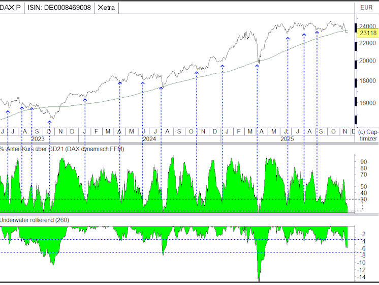 Eine Entwicklung mahnt aber zur Vorsicht: Der DAX notiert unter der 200-Tage-Linie (violett), wodurch die übergeordnet bisher positive Trendbeurteilung ins Wanken geraten könnte. Erfahrungsgemäß führen überverkaufte Zustände in solchen Konstellationen wie zuletzt 2022 nur zu kurzen Gegenbewegungen, da Anleger höhere Kurse zum Ausstieg nutzen. Umso bedeutender ist eine rasche Rückeroberung des langfristigen Durchschnitts bei rund 23.470 Punkten. Saisonale Faktoren begünstigen dies: Die bevorstehende Thanksgiving-Woche gehörte statistisch zu den stärksten Phasen.