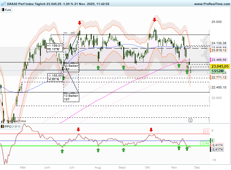 Charttechnisch verschärft sich die Lage: Der zeitweise Rückfall unter das Juni-Tief bei 23.000 Punkten erhärtet den Eindruck, dass die seit Mai laufende Seitwärtsbewegung eine obere Umkehrformation ausbildet. Die daraus ableitbare Zielprojektion läge bei rund 22.200 Punkten (siehe Markierung links). Allerdings haben frühere Ausbrüche auf der Oberseite wiederholt Fehlsignale geliefert – und genau dasselbe könnte nun auf der Unterseite gelten. Die zunehmend überverkaufte Marktbreite sollte daher eher eine Gegenbewegung in Richtung 24.000 einleiten.