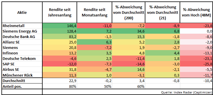 Die Monatsbilanz zeigt ohnehin nur fünf Gewinner – ein überschaubares Feld. Vier der zehn größten Werte (Rheinmetall, Deutsche Telekom, SAP, Münchener Rück) notieren inzwischen unter ihrer 200-Tage-Linie. Besonders kritisch erscheinen SAP und die Telekom, da hier der Mittelwert bereits deutlich fällt. Im Gegensatz dazu wirkt der Aufschlag von 35 Prozent bei Siemens Energy stabil, historisch betrachtet aber eher moderat. Für 2026 starten die DAX-Schwergewichte damit sehr unterschiedlich: Trendstärke trifft auf Schwäche. Anleger, die auf ein Comeback angeschlagener Titel setzen möchten, sollten daher eher Papiere mit Puffer wählen.