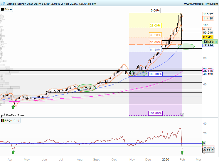 Bevor wir uns Silber aus technischer Sicht widmen, ein kleiner, aber notwendiger Disclaimer: Chart- und markttechnische Analysen funktionieren am zuverlässigsten in ruhigen bis moderat volatilen Phasen. Bei extremen Bewegungen – ausgelöst von zu viel Gier oder Angst – sinkt die Signalqualität deutlich. Ein anschauliches Beispiel: Mitte Dezember erreichte Silber bei rund 60 Prozent Aufschlag auf seine 200-Tage-Linie ein historisch kritisches Niveau. Seit 1982 endeten nahezu alle Aufwärtsbewegungen bei ähnlichen Quoten. Die aktuelle Rally hat sich davon nicht einschüchtern lassen und sogar die 121USD-Marke erreicht.