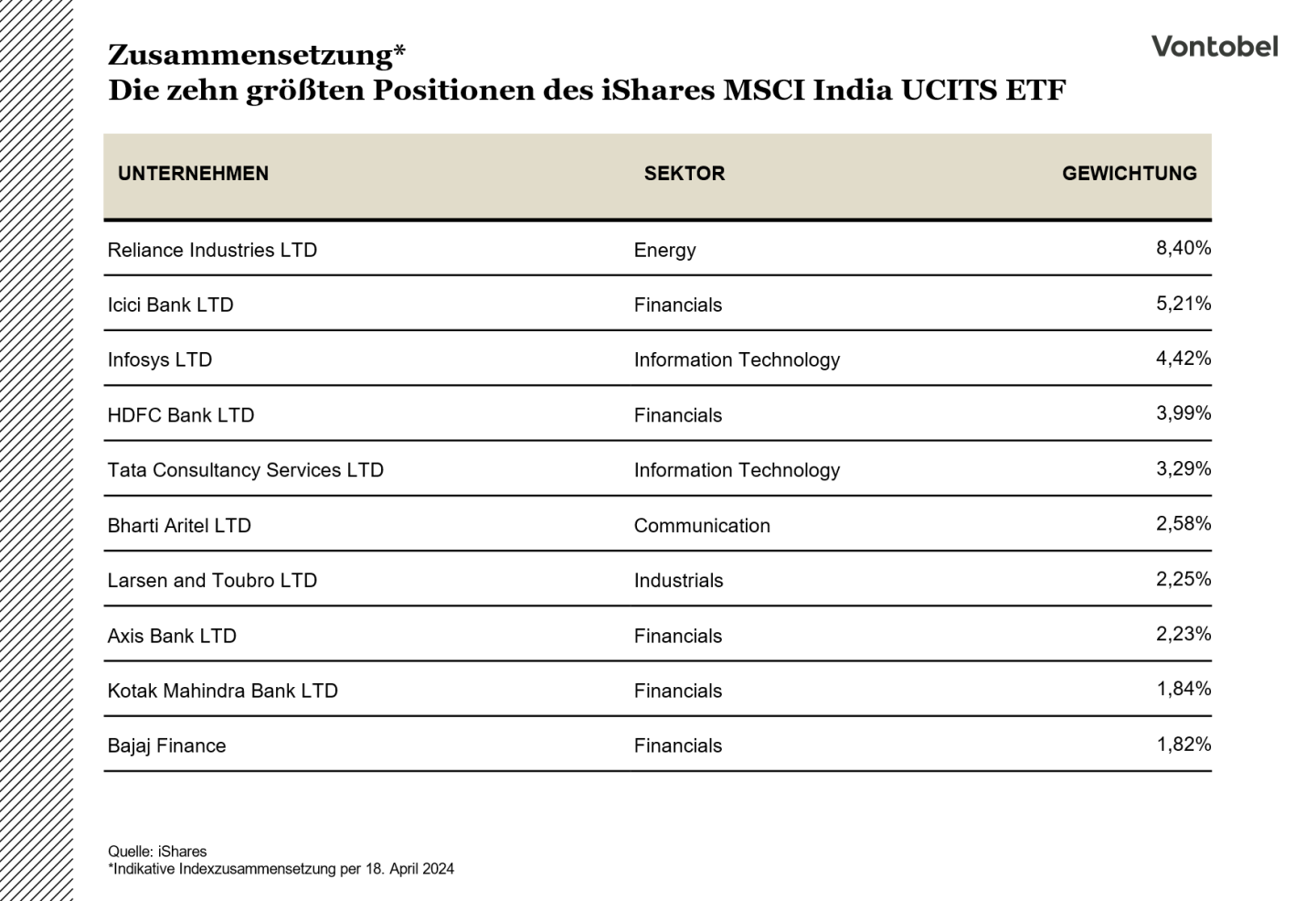 Der iShares MSCI India UCITS ETF bietet mit seinen 136 Positionen Zugang zu den größten und umsatzstärksten Unternehmen des indischen Aktienmarkts.