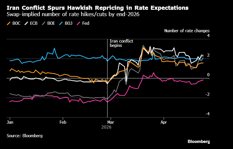 Der Iran-Konflikt hat an den Zinsmärkten eine bemerkenswerte Neubewertung ausgelöst. Wo zuvor noch die Hoffnung auf baldige Lockerung dominierte, preisen die Swap-Märkte inzwischen ein deutlich restriktiveres Notenbankbild ein. Besonders bei EZB, Bank of England und Bank of Canada sind die Erwartungen spürbar nach oben geschnellt; auch bei der Fed ist die Zinssenkungsfantasie merklich geschrumpft. Die Botschaft der Märkte ist klar: Geopolitik ist kein Randrisiko mehr, sondern ein potenzieller Inflationstreiber.